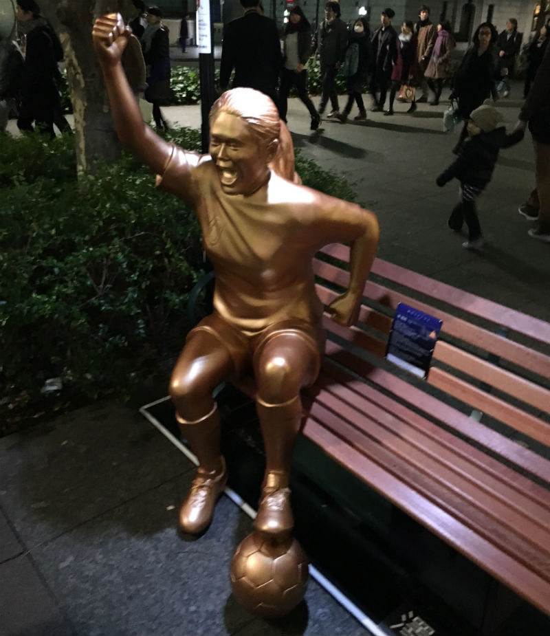この銅像は、ラグビー日本代表FB五郎丸歩(あのポーズで丸の内オアソに設置)のベンチアートに匹敵するインパクトだ。ベンチに座っているという違いはあるものの、2011年女子ワールドカップ決勝でのゴールシーンを再現したものと言えるだろうか。