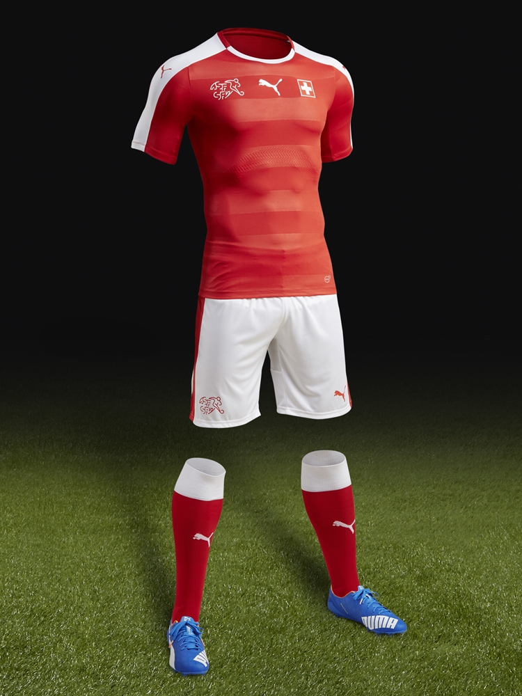 シャドーボーダーを採用したスイスの新しいホーム。左胸には2010年の南アフリカワールドカップに向けたモデルで追加された国旗が引き続き掲げられている。