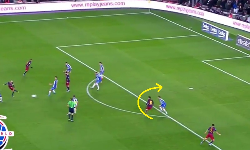 ハンドをアピールするスアレスと入れ替わる形で中央へ入り込み、イニエスタと呼吸を合わせたメッシ。