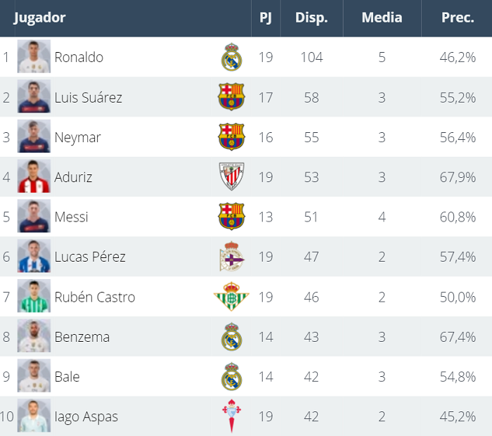 1位のロナウドが104本なのに対して、2位のルイス・スアレスは58本。そう、なんとロナウドとは2倍近い差がついているのだ!