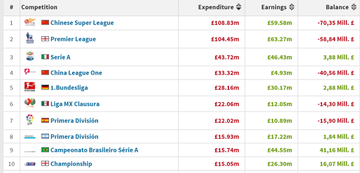 左から順に順位、リーグ名、総支出(補強に費やした移籍金の総額)、総所得額、差額となっている。