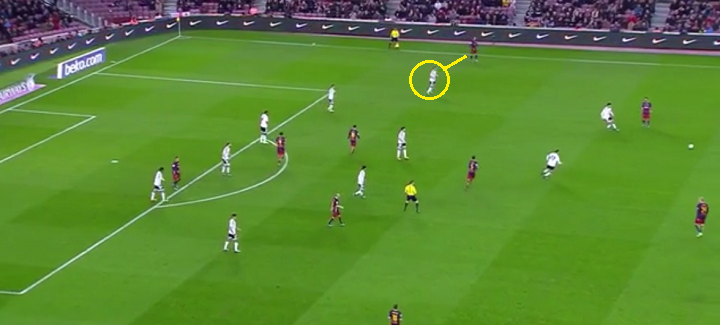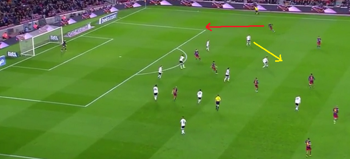 セルヒオ・ブスケツがピッチ中央でボールを持つと、バレンシアDFの背後を取ったアレイシ・ビダルがオーバーラップ。