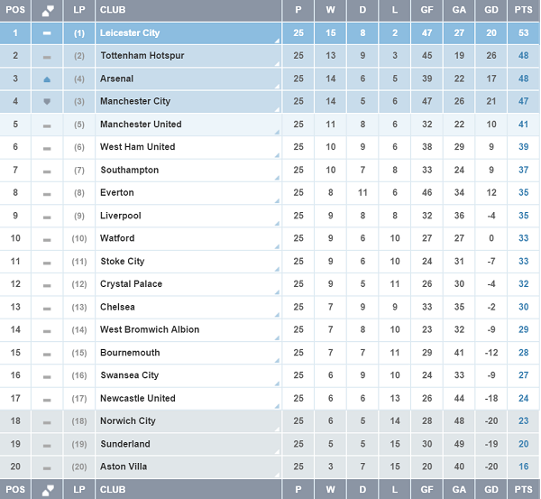 現時点で首位を走り、5位とは12ポイント差をつけるレスターは98%、2位トッテナムは88%、3位アーセナルは95%、4位シティは96%であるそうだ。
