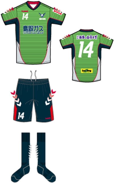 ホーム(1st)は、大山や氷ノ山、鳥取砂丘や日本海など鳥取の雄大な自然とその勢いをシャドーのボーダー柄で表現。ガイナーレカラーであるライトグリーンと紺を例年よりも濃い、威厳のあるカラーリングとし、またシャツに合わせ、パンツとソックスは紺を基調としたデザインに変更している。