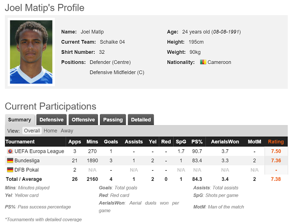 UEFAヨーロッパリーグでのレーティングが「7.50」、ブンデスリーガでのレーティングが「7.36」と高評価がつけられている。