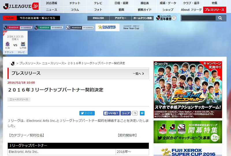 Jリーグは、『Electronic Arts Inc.(EA)』とJリーグトップパートナー契約を締結することを発表した。