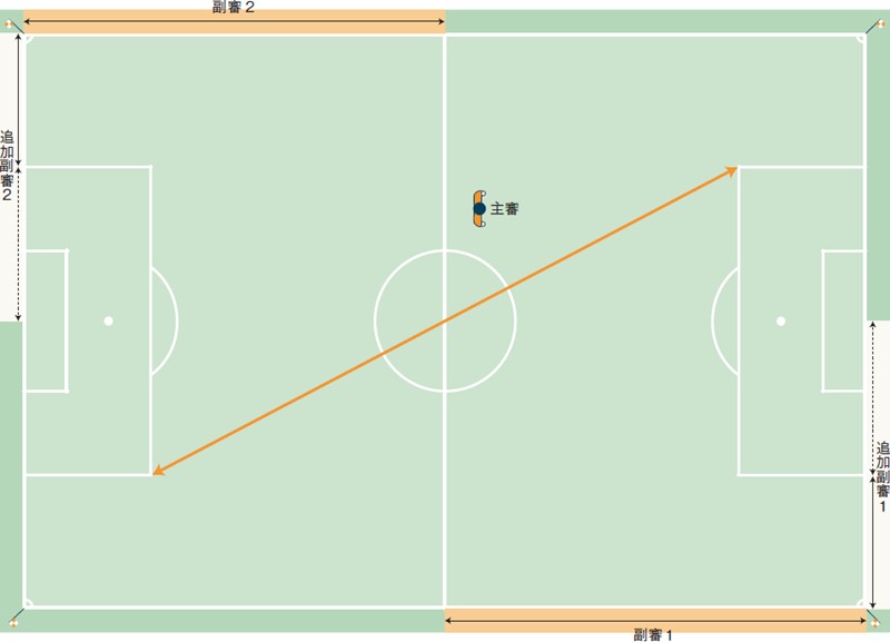 両ゴールから見てそれぞれ左側のタッチライン際に副審が立ち、ピッチの半分のエリアをカバー。主審は副審の反対サイドを中心に斜めに動くことが基本となる。11人制サッカーならアマチュアであっても当たり前のことだ。