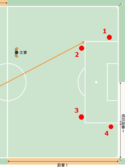 前述の「追加副審の導入を決定」に関するJリーグのリリースに付帯されていたPDFから抜き出した画像で、審判の試合中における一般的な位置取りが示されている。