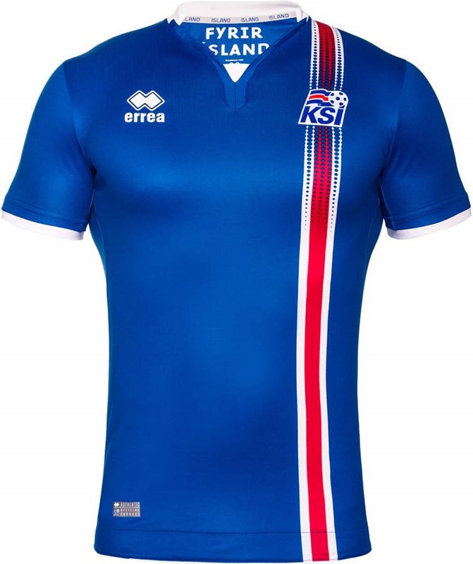 ホームは伝統の青を基調に、国旗に触発された赤と白のストライプが印象的なデザイン。内側に見える『Fyrir Island』は、アイスランド語で「アイスランドのために」という意味だ。