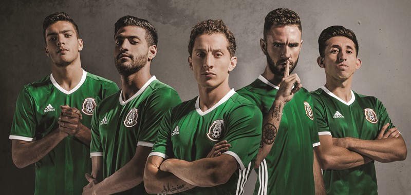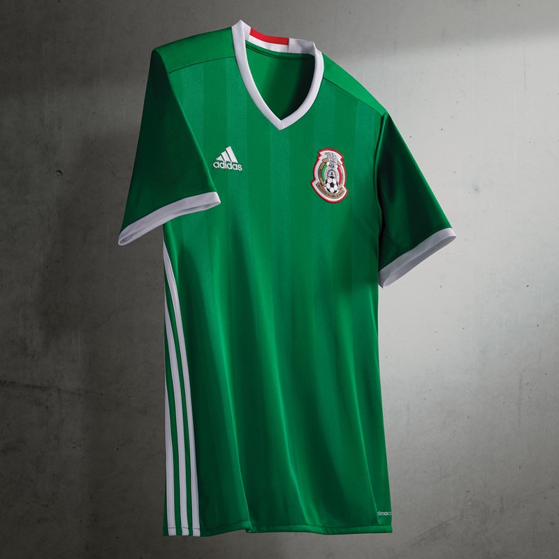 2014年ワールドカップはアメコミ風、続いて登場した2015モデルでは全身黒のデザインが話題を呼んだメキシコのホームだが、今回は伝統の緑を基調に白のVネックとシャドーのストライプ柄を採用したクラシカルな仕上がり。