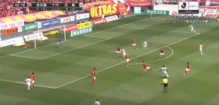 画面上、数えられるだけで名古屋のフィールドプレイヤーは8人、もしかしたら味方である広島の選手も騙される意表を突いたパスから、佐藤のメモリアルゴールは生まれたのである。