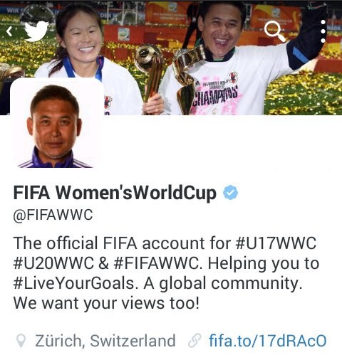 スマートフォンから撮影したキャプチャーで恐縮だが、プロフィール画像が佐々木監督の顔写真に、カバー画像が2011年ワールドカップで優勝した際の佐々木監督と澤穂希の2ショット写真になっている。