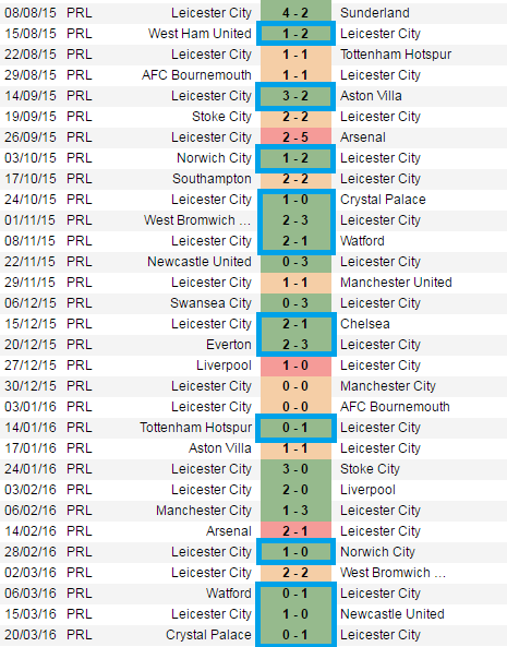 『Soccerway』を参考に、今季のレスターの試合結果を調べてみた(リーグのみ)。