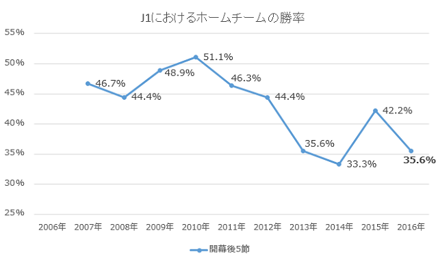 まず調べたのは、過去10シーズンにおける開幕後5節のホームチームの勝率だ。