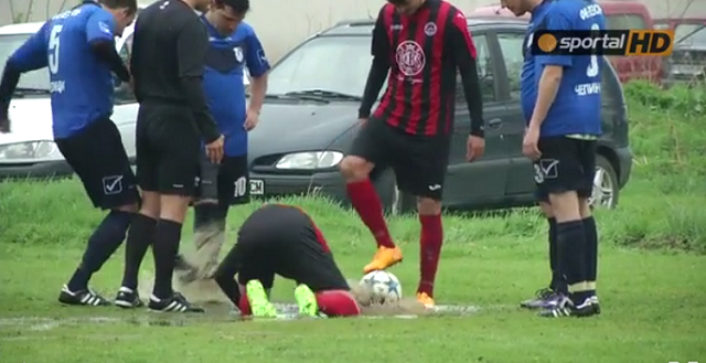 ブルガリアで行われていた下部リーグもそうした天候の中で行われており、皮肉にもペナルティスポットの付近に大きな水たまりがあった。