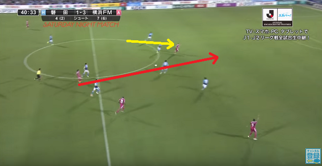 1-3とリードして迎えた41分、自陣中央で小林祐三からのパスを受けた中村は巧みなタッチで磐田の選手2人を惑わす。