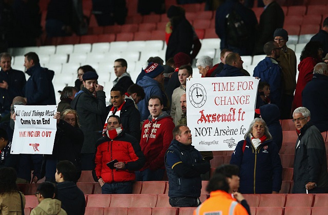 観客席には、ヴェンゲルに対して辛辣なメッセージを送るファンの姿もあった。左の男性は「どんなに良いことも必ず終わりがやってくる。ヴェンゲル、出て行け」、右の男性は「変革の時だ。アーセンFCではなくアーセナルFC」と書かれたプラカードを掲げている。