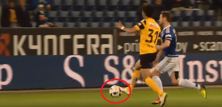 一度地面に付いたボールの跳ね返りを足裏、というよりほぼつま先の裏側で勢いを巧みに殺し、シュートを撃てる位置へコントロールしていたようだ(よく見るとユニフォームを引っ張られながら…である)。