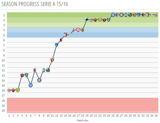 そんなユヴェントスの順位推移グラフを見てみると、見事なまでに「右肩上がり」であった。