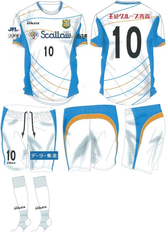 白を基調とした爽やかなアウェイ。ユニフォームスポンサーは、背中の「眞照堂」、パンツの「デーリー東北」が継続。胸は「抗菌研究所」、袖は「三八五流通」とそれぞれ新たに契約を結んでいる。