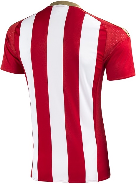 伝統の赤と白のストライプを基調に、エンブレムにも使われているゴールドを差し色として取り入れたデザインを採用。スリーストライプスは肩に配置されている。