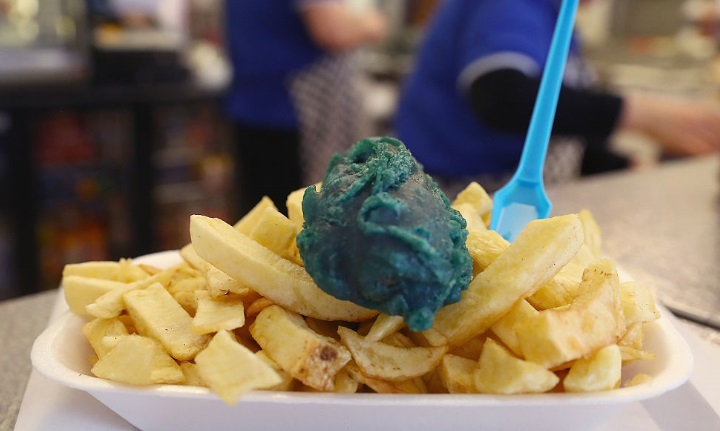 青いのはソース…ではなく、ソーセージを揚げたもの(battered sausage)だ。