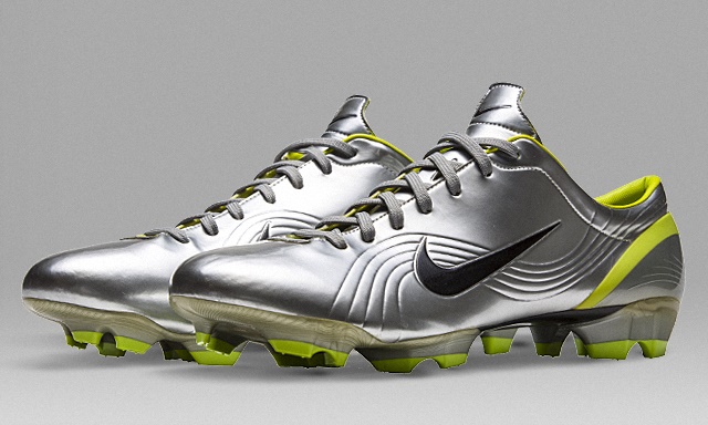 ロナウドがシルバークローム、ブラック、ボルトのカラーを着用し、2002年の夏に始めてピッチに登場させた「ナイキ マーキュリアルベ ヴェイパー I」には、たくさんの「はじめて」採用されたものがあります。まずこれが、ナイキにとってはじめて200gを切ったフットボールスパイクであり、アッパーに縫い目をつけない仕上げを施し、さらにはじめて解剖学に基づいて開発した足型を用いて成形されています。