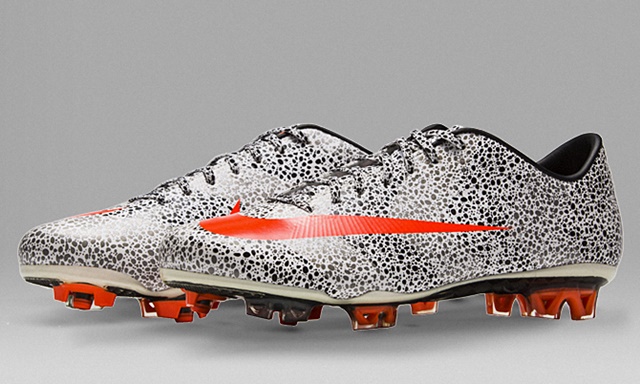 クリスティアーノ・ロナウドが、マドリードダービーで初めて着用した「CR マーキュリアルヴェイパー スーパーフライ II」 には、ナイキではアイコン的存在のオーストリッチスキンのプリントが採用されています。ナイキ クリエイティブ デザイン担当副社長のティンカー・ハットフィールドがデザインしたこのプリントは、1987 年発売のランニングシューズ、エア サファリに使われたもので、ロナウドのスタイルやスピードを表現するためにフットボール スパイクに用いられることになりました。同系カラーのV字の模様は、まっすぐな光を浴びた時にのみ光るようにその形を見せる一方、このスパイクに採用されたスタッドシステムは、サーフェイスの状況に応じて長さが変わるようになっています。