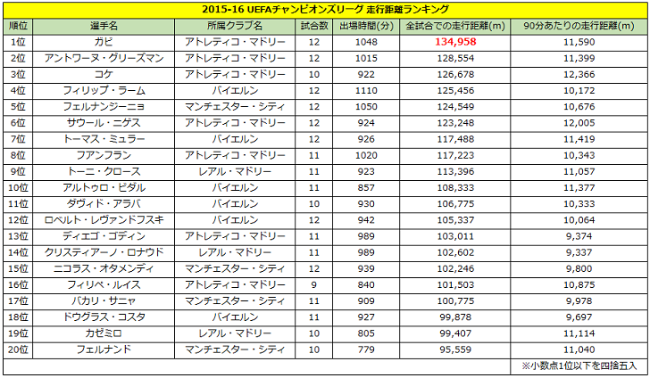その内訳はアトレティコ7人、バイエルン6人、シティ4人、マドリー3人。なかでもアトレティコの選手がTOP3を占めており、さすがの数値を残している。