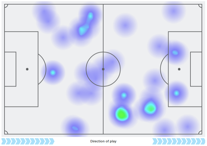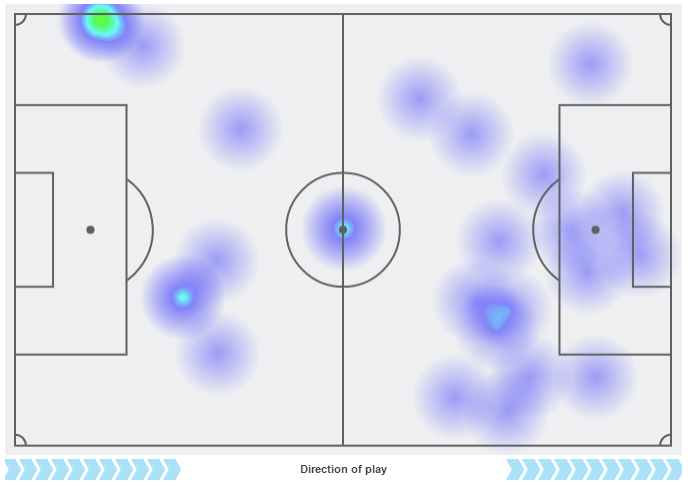 優勝を決めたマンチェスター・ユナイテッドとの1戦。一番色がついているのは何と左サイドの後方である。これは、左サイドバック岡崎と言えるのだろうか?
