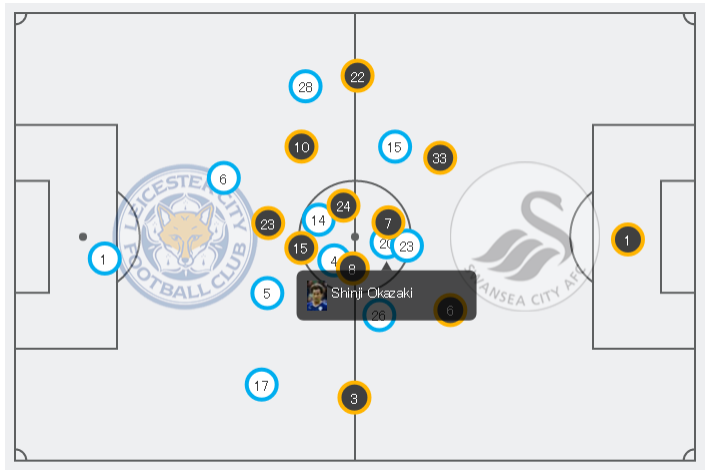4月24日のスウォンジー・シティ戦でも同様だ。これを見るにウジョアの背後に岡崎がいる。パートナーが変わっても役割は変わらないのだ。