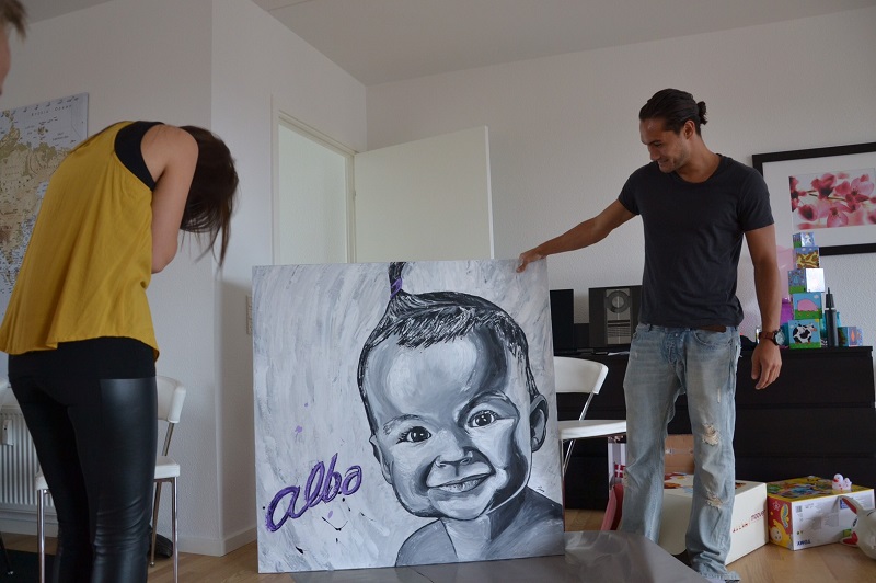 別の日にチームメイトの子供が1歳の誕生日をむかえる時に、奥さんには内緒でサプライズなアート(娘の顔)を描いてほしいと頼まれました。俺は1mくらいのでかいキャンバスに、チームメイトの子供の顔を描いたわけです。そして誕生日にサプライズアートを発表したんですよ。チームメイトの親族が30人いる中で披露したから、俺も結構緊張していました。その絵を見たギャラリーが号泣しちゃって、赤ちゃんも動揺してましたね(笑)。これだけ俺のアートで感動してくれるのは嬉しくてたまらなかったですね。アートのパワーって凄いなと俺は強く思いましたね。