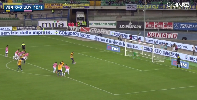 ピンク色のシャツを着たユヴェントス選手の多くがすでにペナルティエリア内に入っていた!