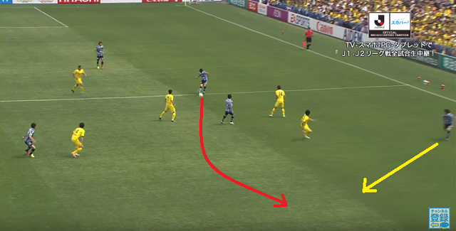 ある程度俯瞰して見るとイメージが湧きやすいのだが、ピッチの後方からこのパスコースが見えているあたりは流石である。パスが出る前から登里は走り出しており、受け取る側の動きも見事だった。