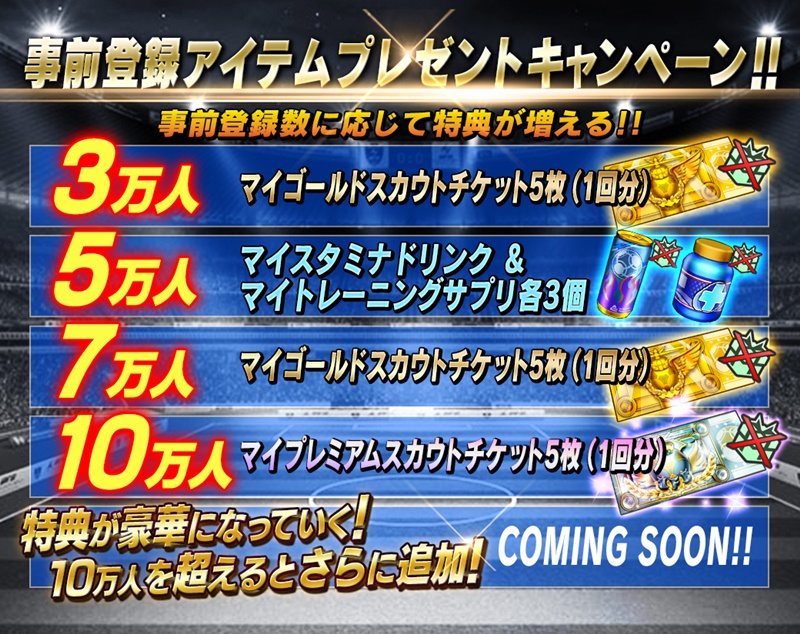 これに合わせて、リリースに先駆け強力な選手を入手できる「事前ガチャキャンペーン」と、事前登録者数に応じて豪華ゲーム内アイテムをプレゼントする「事前登録全員プレゼントキャンペーン」も実施される。