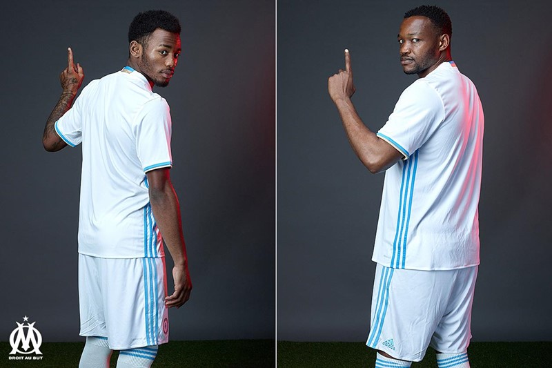 ホームは白を基調に水色のクロスモチーフを配置した伝統のデザイン。「白に青十字」は旗などに使われているマルセイユの街のシンボルで、ユニフォームにもたびたび採用されている。