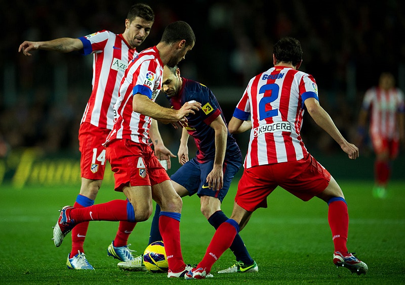 この写真は、2012年12月のバルセロナ戦、アンドレス・イニエスタをガビらが囲んでいる。シメオネ就任以降見られる全く一貫した光景だ。