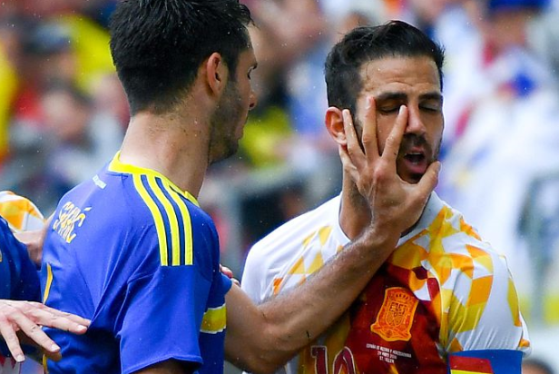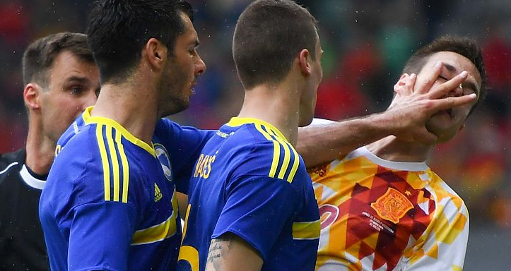 スローインを巡ってダビド・シルバとオグニェン・ヴラニェシュが一悶着。そこにセサル・アスピリクエタが仲裁に入ったのだが、不意に現れたエミール・スパヒッチが顔面を引っ叩いたのだ!