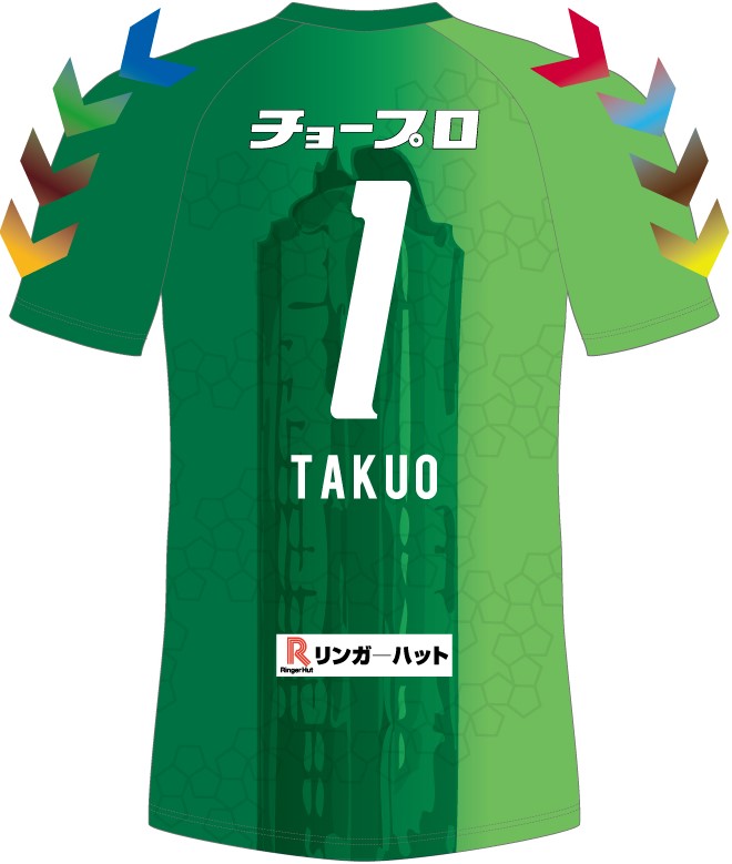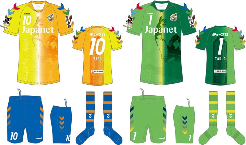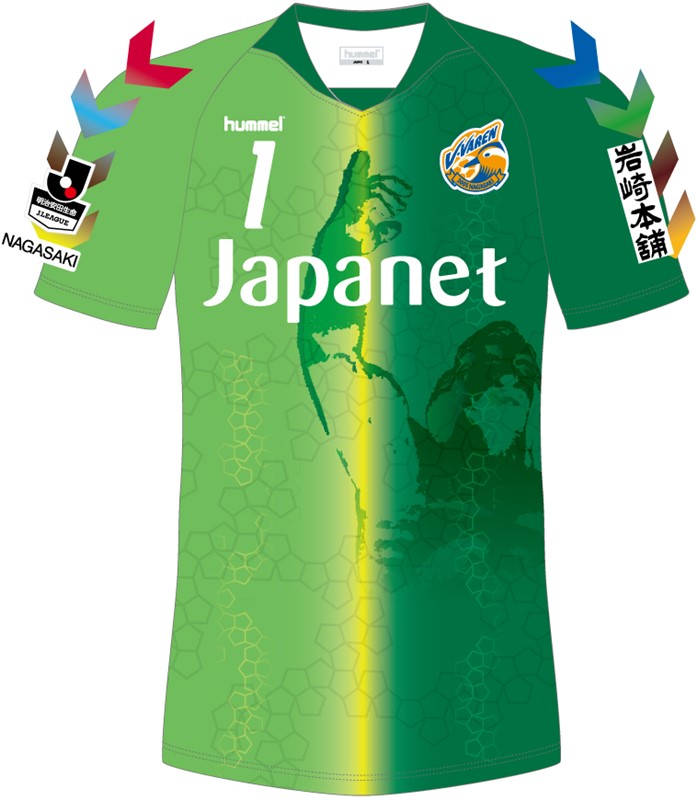 こちらはGKユニフォーム。FPのユニフォームカラーが聖火をイメージしたオレンジと黄色であるのに対し、GKの緑と黄緑は、焦土と化した長崎の地から再生した緑の木々を表している。