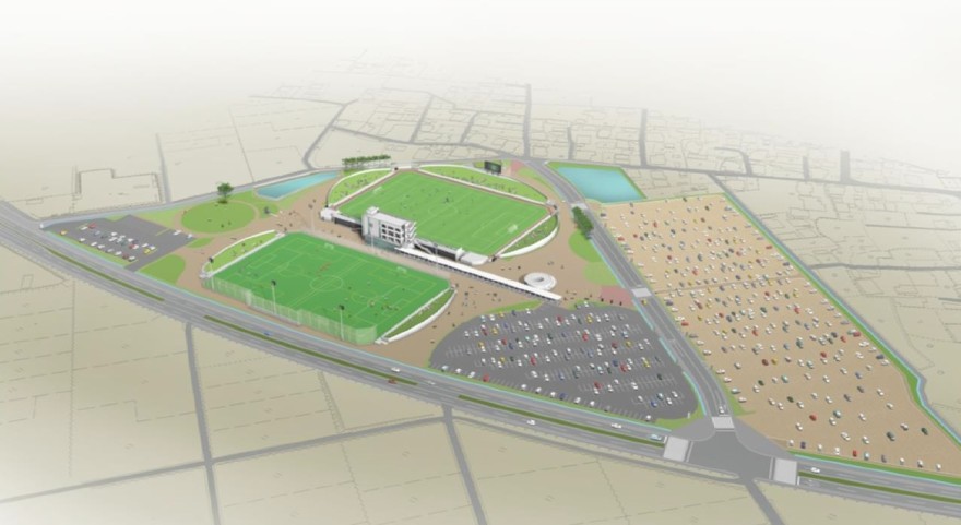 多賀地区多目的運動施設の全景。中央上(東側)、白い管理棟に面するのがメインスタジアム、下(西側)がサブ。周囲には広大な駐車場が用意される。