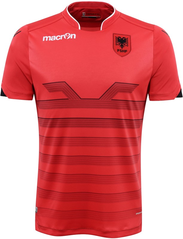 アルバニアはEURO2016に向けてMacronと契約。今大会に向けた新ユニフォームは伝統的な赤を基調に、国旗にも使われている「双頭の鷲」を模したボーダー柄のグラフィックな印象的なデザインとなっている。