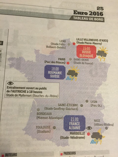 地図を用いて試合の開催都市を紹介しているのだが、キックオフ時間の予想天気もしっかりと伝えている。これは遠征に出かけるファンにとってもありがたい…。