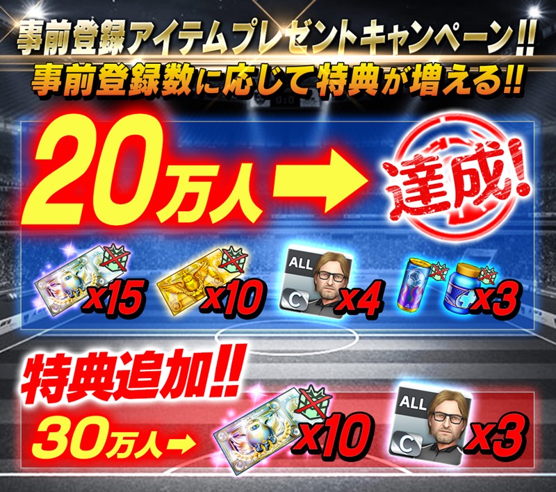 また、事前登録の目標数に新たに追加された「30万人」では、「マイプレミアムスカウトチケット」×10、「ランクCコーチ(ALL)」×3が設定されている。果たして実現は!?
