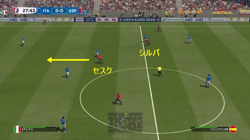 スペインが最終ラインからビルドアップ。4-3-3の右ウィングに入ったダビド・シルバが落ちてボールを受けると、空いたスペースにセスク・ファブレガスが走り込む。