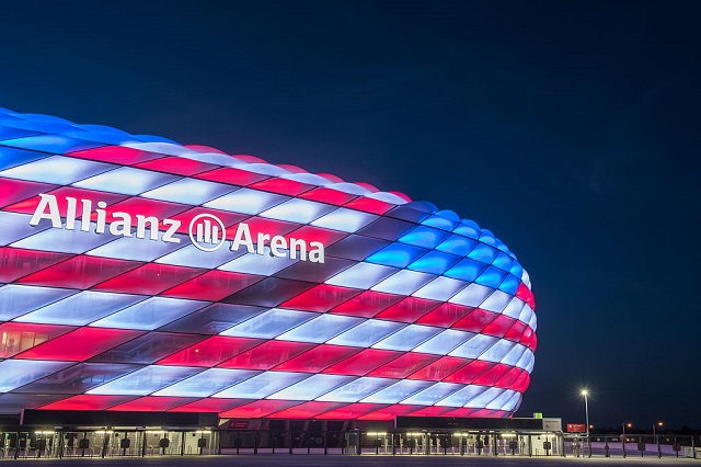 旭硝子製の特殊フィルムは発光可能であり、バイエルン戦では赤色に、1860ミュンヘン戦では青色に、そしてドイツ代表戦では白色にライトアップされることで知られるこのスタジアム。