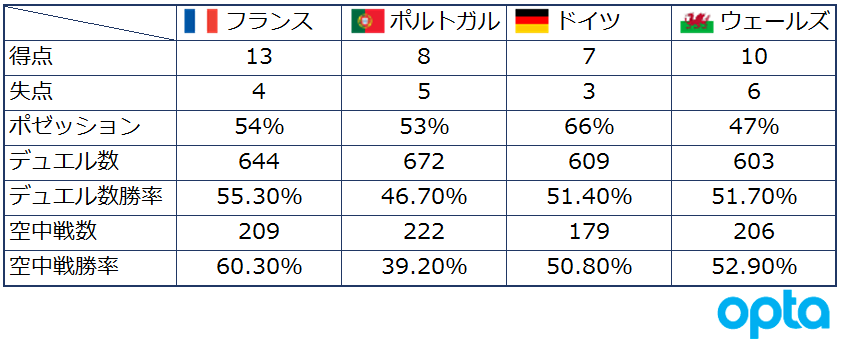 フランスもポルトガルもポゼッション率、デュエル数、空中戦数に大きな差はない。だが、フランスがデュエル、空中戦で勝率が高いのに対してポルトガルは4チームで唯一デュエル、空中戦ともに50%を下回っている。