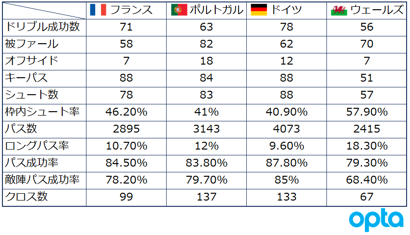 フランスに比べて、ポルトガルは攻撃面で幾つか光るポイントがある。まずは、今大会では左サイドバックのラファエル・ゲレイロに注目が集まっているが、クロス数137が光る。また、オフサイドが非常に多く、被ファール数も優れている。