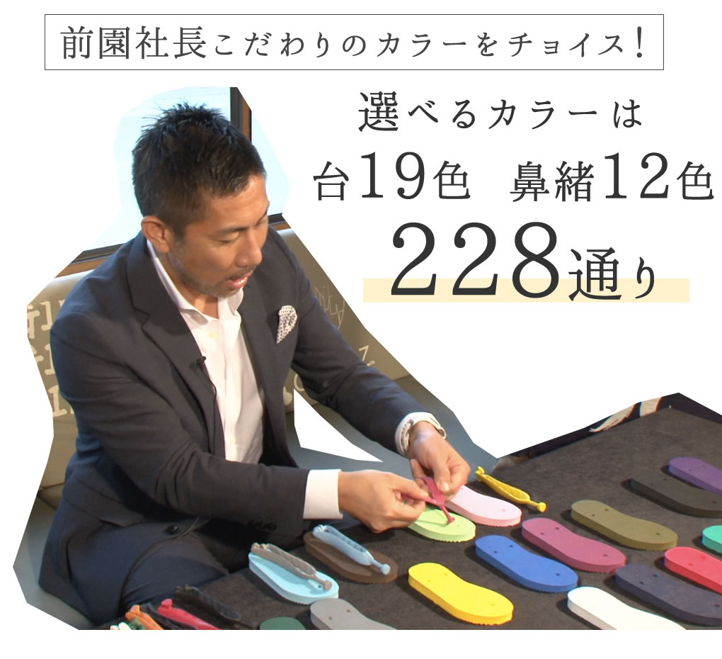 日本人の足に合わせた最高の履き心地を追求した日本製ビーチサンダルの九十九(つくも)サンダルの、色19色、鼻緒12色の計228通りの中から、前園が選んだ4色に、Daibuyerオリジナルキャラクターの「イブラ」と愛豚の「セブン」のイラストを前園社長自ら加えたDaibuer限定のサンダルだという。