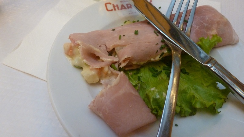 19ユーロ(およそ2212円)でコース料理(パリジャン曰く定食みたいなもの)を頼めるので、おばちゃんギャルソン(女性だと正しくはセルヴーズ)に料理を注文した。おばちゃんはとても元気な方で、早口な英語で料理の説明をする。テーブルクロスに注文を書き、そそくさとシェフに注文を伝えに行った。メモしないで頭にメニューを叩き込む姿を見て、日本では見られない情景だと感心した。