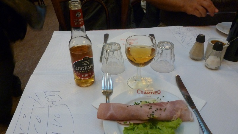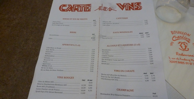 テーブルに案内されてから、配られたメニューを見て驚愕した。安い!パリのカフェで瓶コーラを頼んだ時に、3.3ユーロ(およそ384円)かかったことを考えると驚愕の安さであった(ちなみにトゥールーズの場合、コーラ1.5ペットボルが1.6ユーロ(およそ186円)で売っていた。パリは非常に物価が高い)。